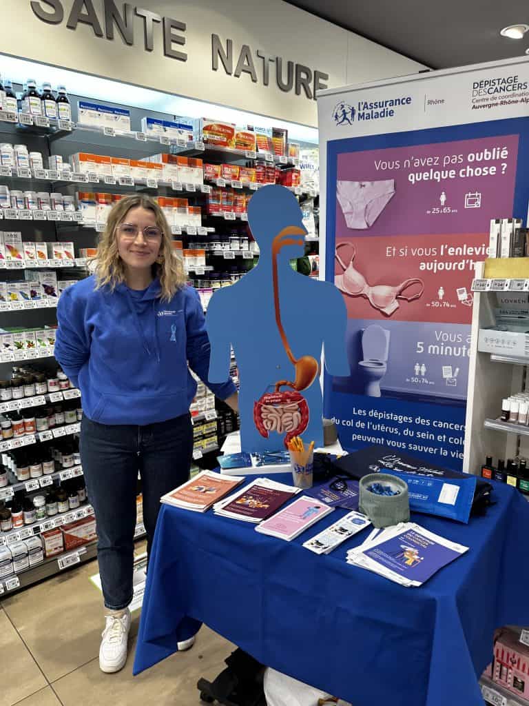 Aujourd’hui, jeudi 20 mars, l’intervenante de la CPAM 🏥 est venue animer un stand de sensibilisation sur Mars Bleu Ă  la pharmacie des Halles Ă  Mions. 🎗️💙